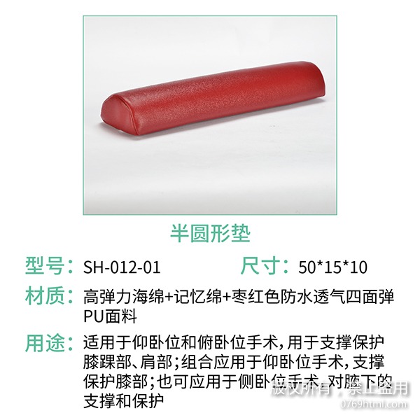 海綿體位墊系列中的半圓形墊,適用于仰臥位和俯臥位手術,常用于支撐保護膝踝部、肩部、組合應用于仰臥位手術,支撐保護胸部和髖部;也可用于側臥位手術等,對腋下的支撐和保護。而且半圓形墊是手術室護理中較常用到的體位墊之一,常規尺寸為50*15*10,如果這個尺寸與您所找的尺寸不符合,也是可以進行定制服務