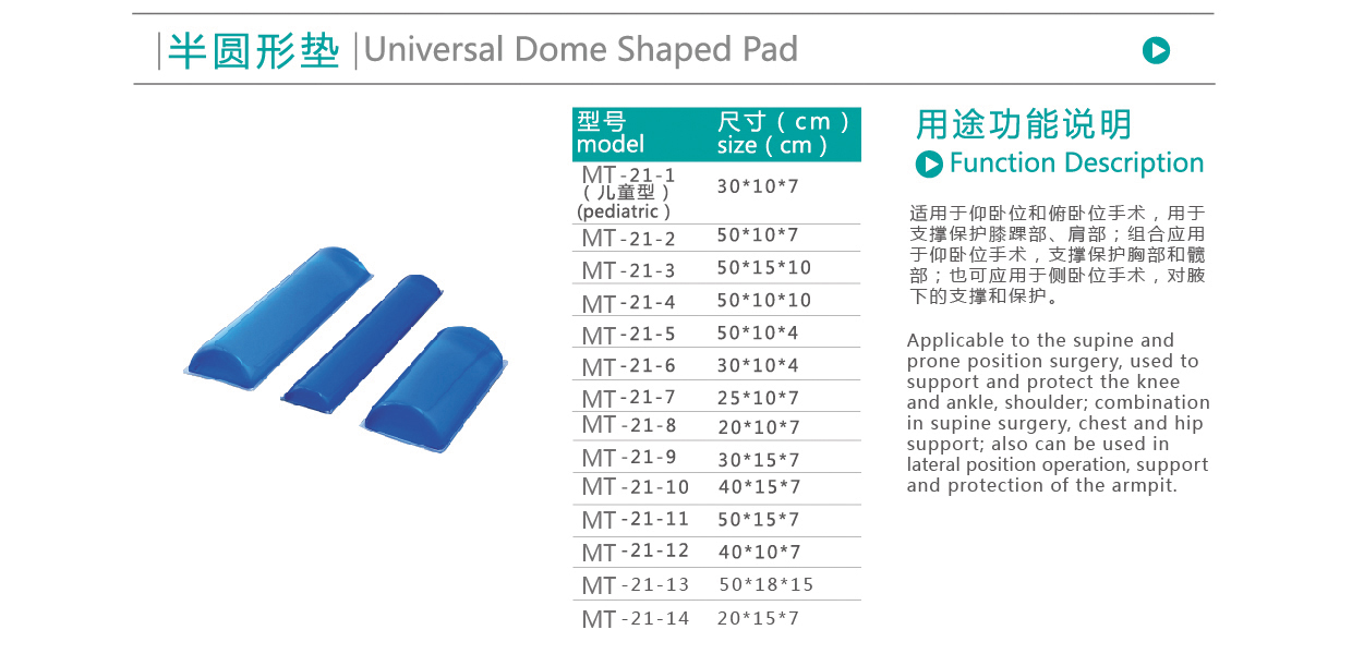 【產品用途】:適用于仰臥位和俯臥位手術,用于支撐保護膝踝部、肩部;組合應用于仰臥位手術,支撐保護胸部和髖部;也可應用于側臥位手術,對腋下的支撐和保護