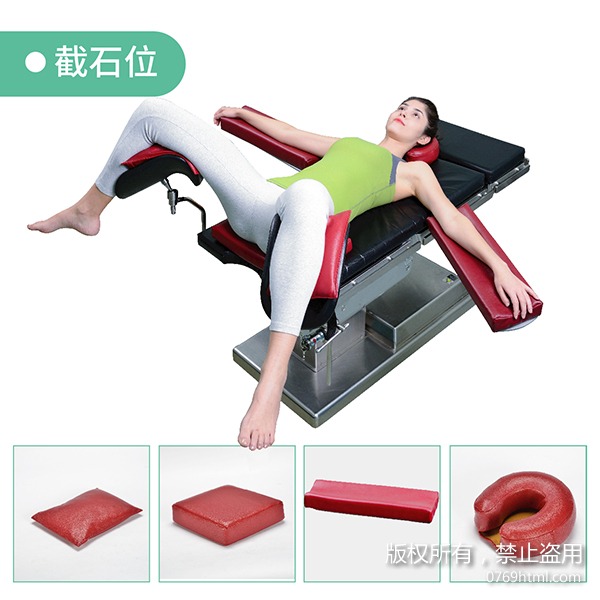 截石位姿勢是患者仰臥,臀部齊手術床緣,兩腿屈髖、雙膝置于腿架上,兩腿間角度約為60-90°。適用于直腸、肛門、會陰等部位手術,接觸病床的頭部、肘部、臀部、腘窩部預防褥瘡需要使用手術體位墊,此方案包含高碗頭圈、上肢凹形體位墊、臀墊和記憶棉方墊。