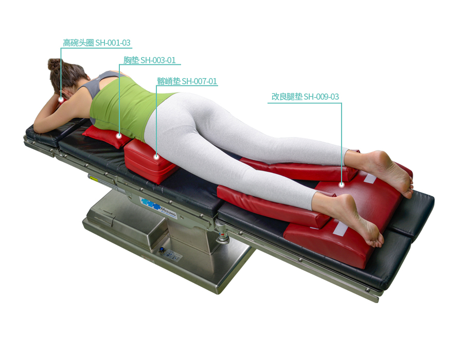 用途:支撐保護雙下肢俯臥位解決方案Ⅰ與俯臥位解決方案Ⅱ中所使用的體位墊其實差別不大,只是把凹形體位墊以及俯臥位腿墊更改為改良腿墊,但是其用途都是為了支撐以及保護雙下肢的。